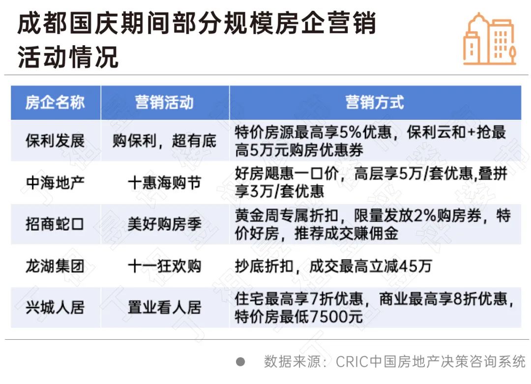以成都市场为例,国庆期间保利发展、龙湖集团等房企营销加大力度,特价房为主的营销方式使得在售项目流速提升明显。根据CRIC调研61个样本楼盘的数据来看,国庆期间有58%项目日均来访量有上涨,51%项目日均认购量有上涨,同时超四成的楼盘认为流速的上升与期间营销力度加大(尤其是推出特价房方式)有关。