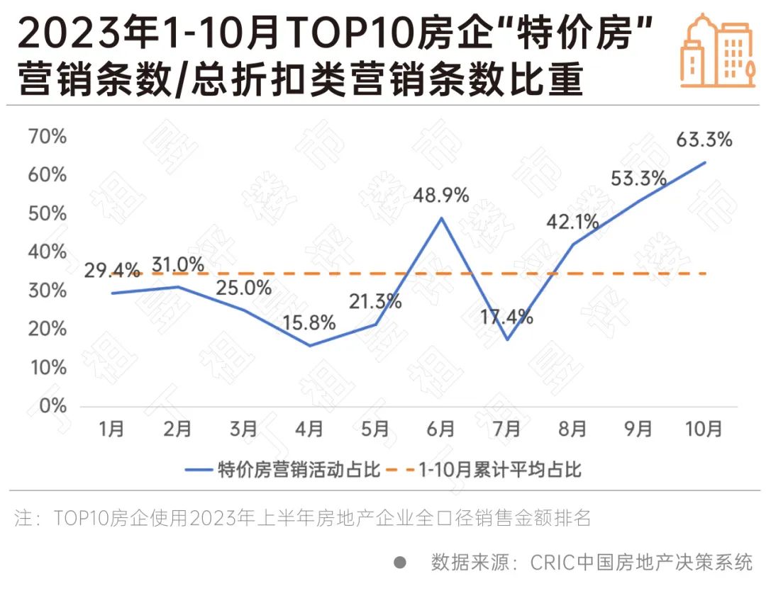 据CRIC统计数据,2023年1-10月TOP10房企今年以来的折扣营销活动中,有35%的折扣方式包含“特价房”。房企出于经营需求和政策放宽两方面的考量,加大了“金九”特价房整体参与规模。