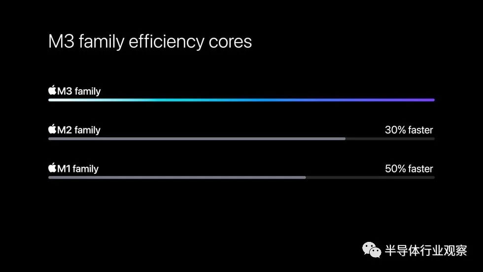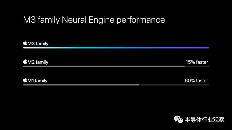 M3 系列中的所有三款芯片还具有先进的媒体引擎,为最流行的视频编解码器提供硬件加速,包括 H.264、HEVC、ProRes 和 ProRes RAW。并且媒体引擎首次支持AV1解码,实现流媒体服务的节能播放,进一步延长电池寿命。