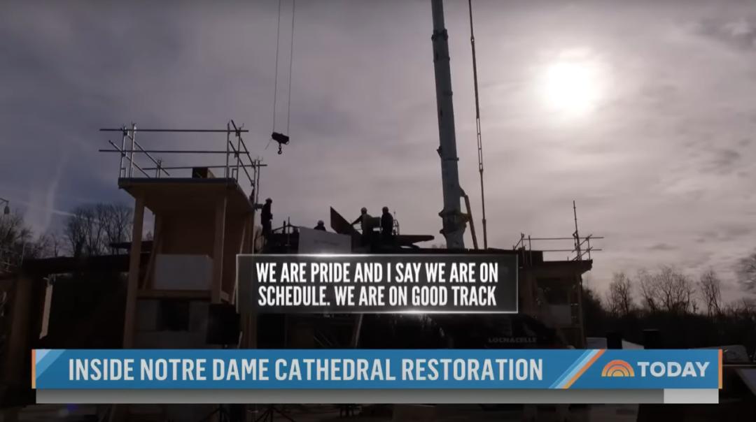 △工作人员组装圣母院塔尖基座。(图/YouTube@TODAY)