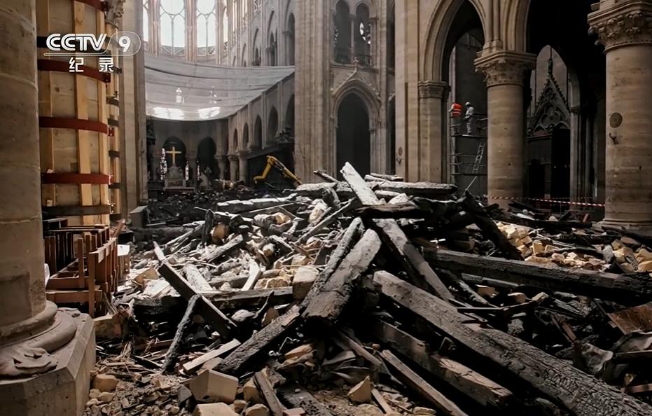 △许多残骸掉落在了教堂内部。(图/纪录片《修复巴黎圣母院》)