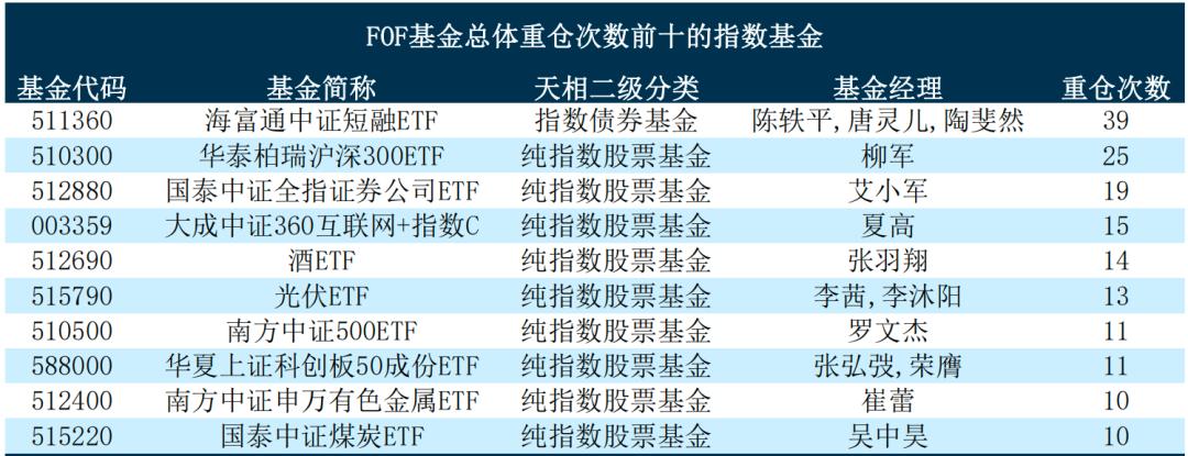指数基金中,海富通中证短融ETF被FOF基金总体重仓次数最高,为39次;其次为华泰柏瑞沪深300 ETF,被FOF基金总体重仓25次。