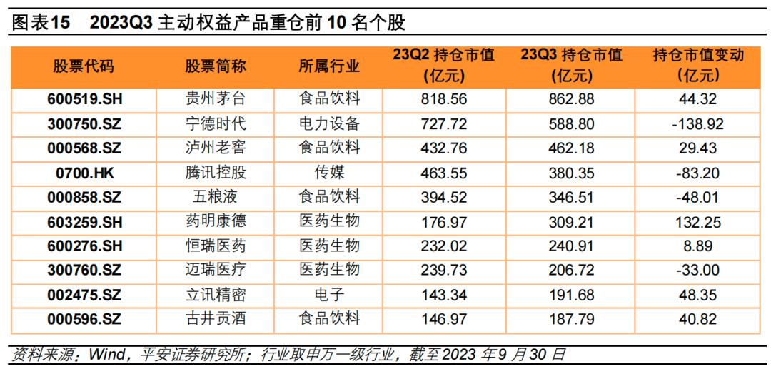 “喝酒吃药”卷土重来。主动权益基金三季度重点加仓药明康德、山西汾酒、药明生物,增持规模超70亿元,宁德时代、中兴通讯、晶澳科技、阳光电源等个股遭减持超100亿元。