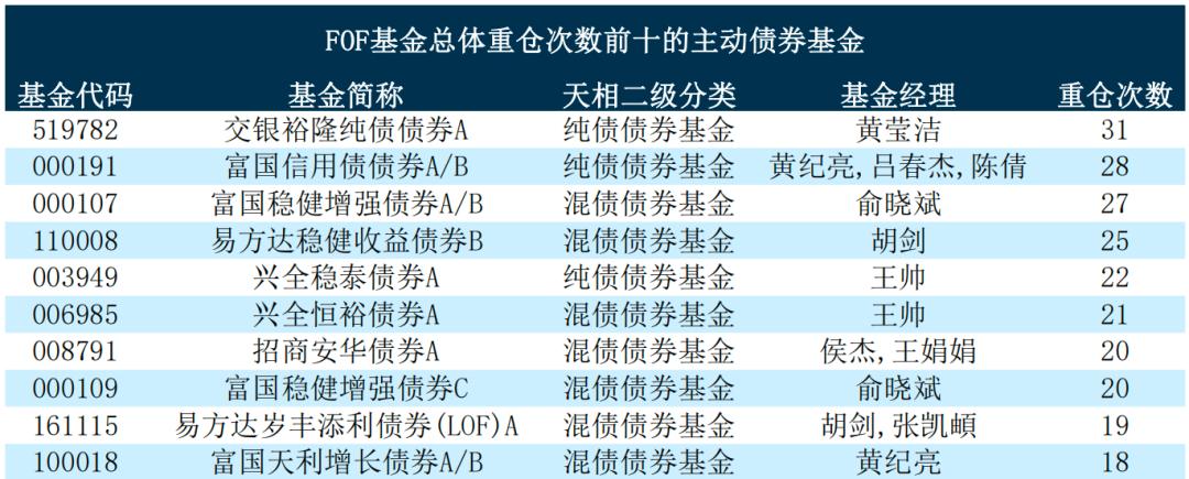 主动债券基金中,交银裕隆纯债债券A被FOF基金总体重仓次数最高,为31次;其次为富国信用债债券A/B,被FOF基金总体重仓为28次。