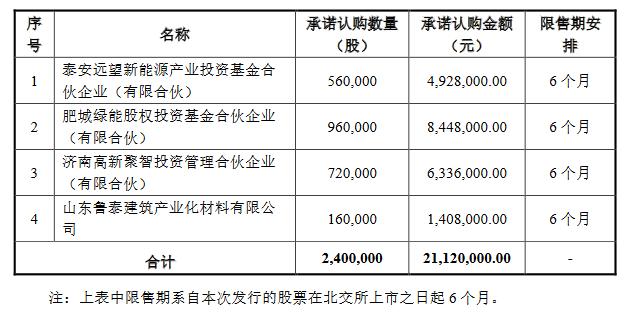 公告显示,4家战投为泰安远望新能源产业投资基金合伙企业(有限合伙)、肥城绿能股权投资基金合伙企业(有限合伙)、济南高新聚智投资管理合伙企业(有限合伙)、山东鲁泰建筑产业化材料有限公司,分别拟认购56万股、96万股、72万股、16万股。