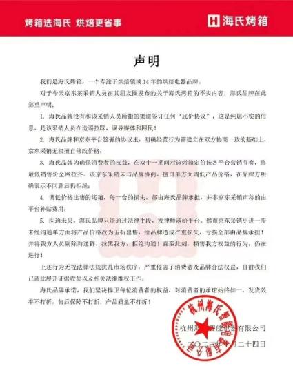 24日下午,海氏发布官方微博称,正在开展证据收集及相关法律维权工作。海氏方面表示,京东多次违反合同约定,直接或间接修改海氏产品销售价,同时,也造成了海氏公司在与其他客户合作合同中的被动违约,即将产生巨额赔偿的风险。