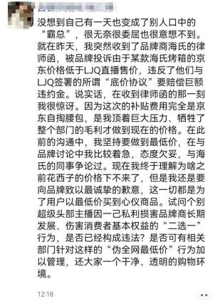 但该工作人员表示,该产品为京东自营产品,其价格低是因为京东自掏腰包进行了补贴,并质疑头部主播有“二选一”行为。
