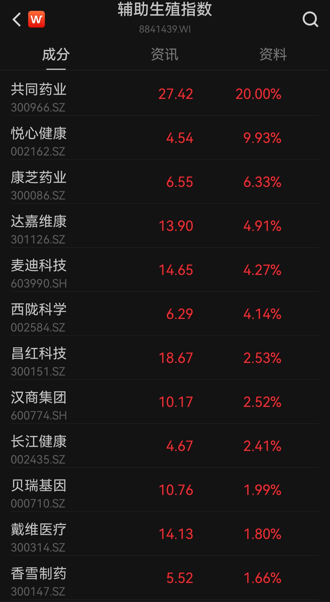 医药板块低开高走,辅助生殖、创新药等细分方向涨幅居前,共同药业20%涨停,奥泰生物、江苏吴中、奥锐特、悦心健康等多股涨停或涨幅超过10%。