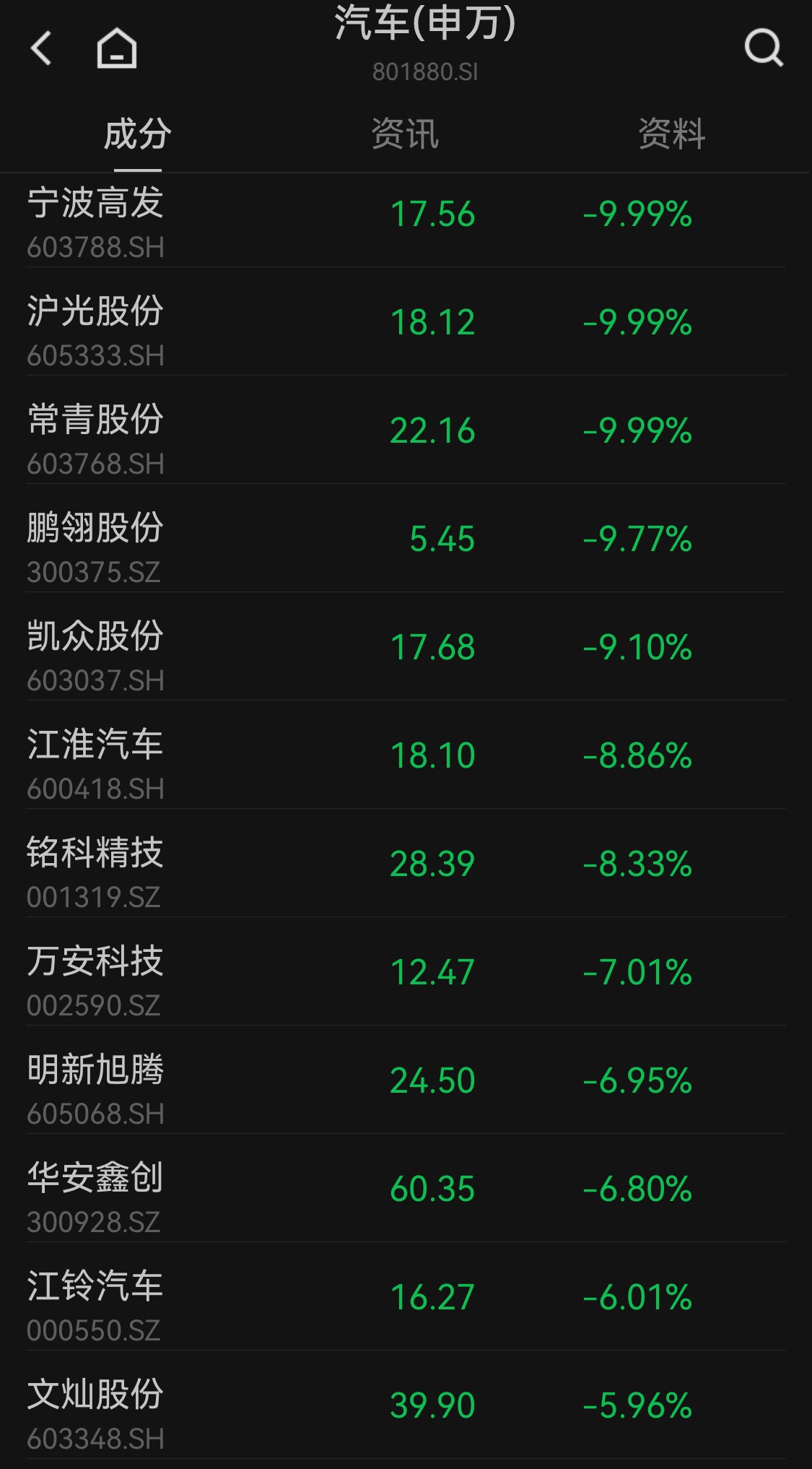 汽车产业链概念持续走低,新能源汽车、一体化压铸方向领跌,宁波高发、常青股份、沪光股份跌停,江淮汽车、铭科精技跌超8%,万安科技、江铃汽车、文灿股份等跌幅居前。