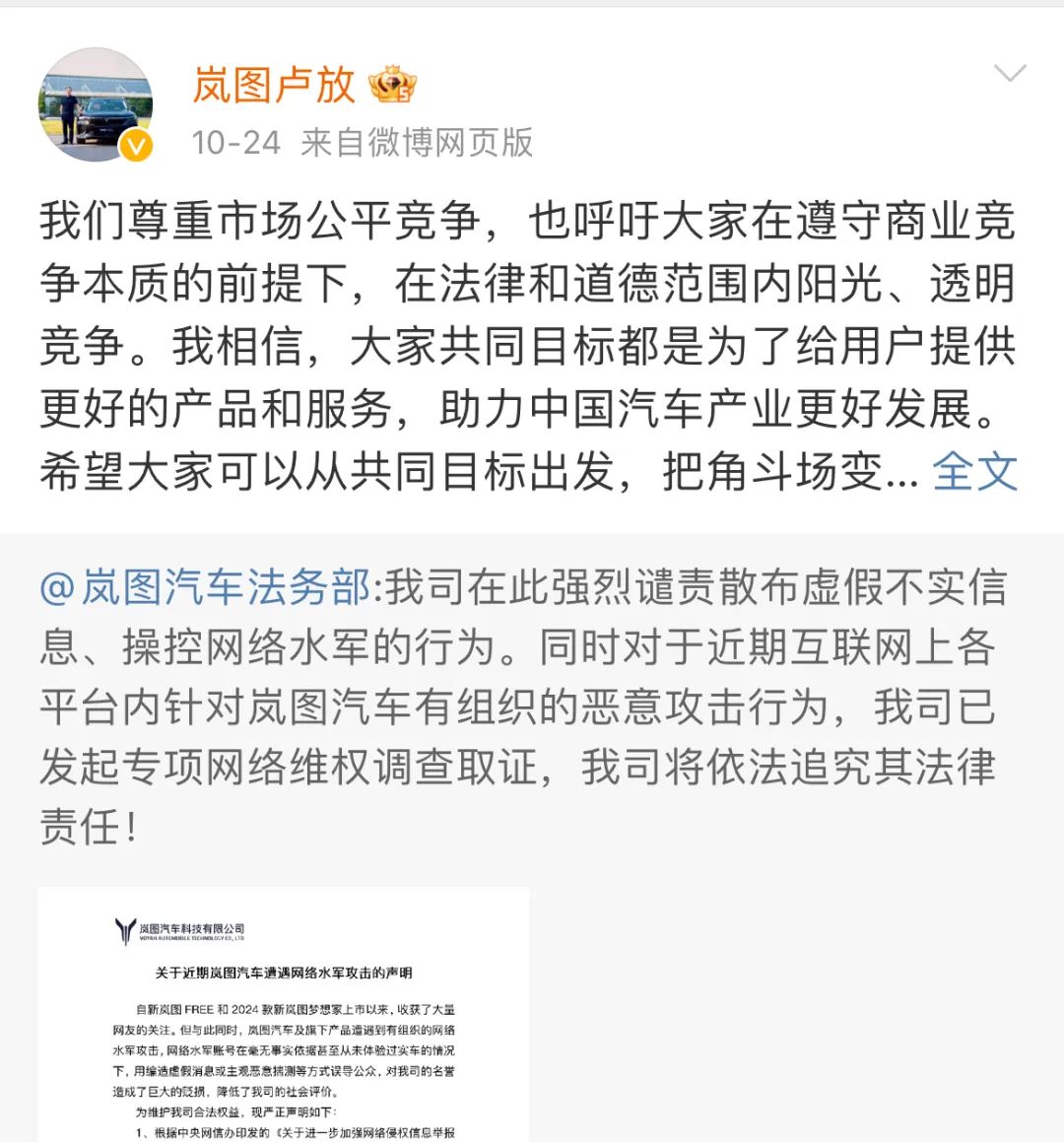 几天前,岚图法务部官微发布了一条义愤填膺的声明,“强烈谴责散布虚假不实信息、操控网络水军的行为”并考虑“依法追求法律责任”。