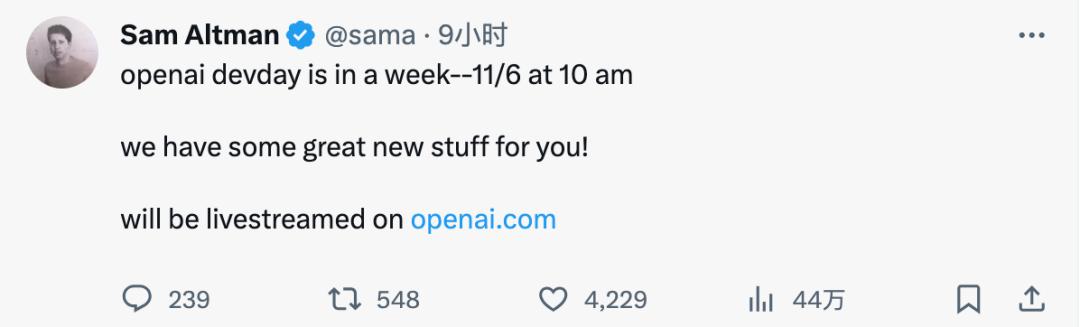 再过几天,就是 OpenAI 的开发者大会了,也许我们能够了解到更多有用的信息,让我们拭目以待吧。