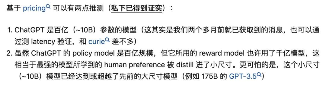 早在 OpenAI 开放 ChatGPT API 时,0.002 美元 / 1k token 的定价就令人们意外,这个价格只有 GPT-3.5 的 1/10。彼时就有人推测:「ChatGPT 是百亿(~10B)参数的模型」,并且「ChatGPT 使用的奖励模型(reward model)可能是千亿级模型」。该推测来源于清华大学 NLP 在读博士郑楚杰的知乎回答。