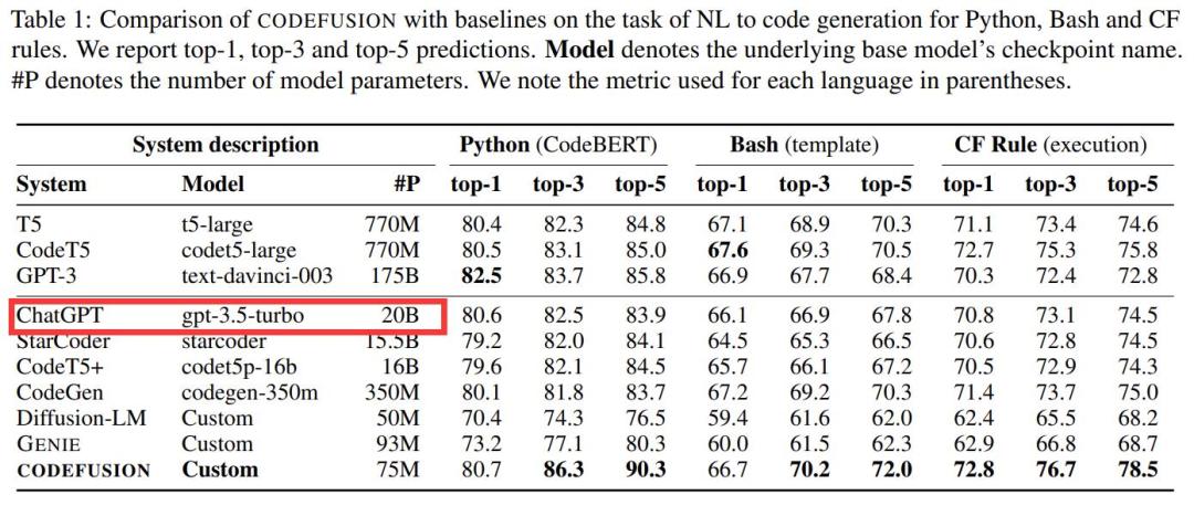 具体来说,微软这篇论文提出了一种预训练的扩散代码生成模型 ——CodeFusion。CodeFusion 的参数量是 75M。在实验比较部分,论文的表 1 将 ChatGPT 的参数量明确标成了 20B。