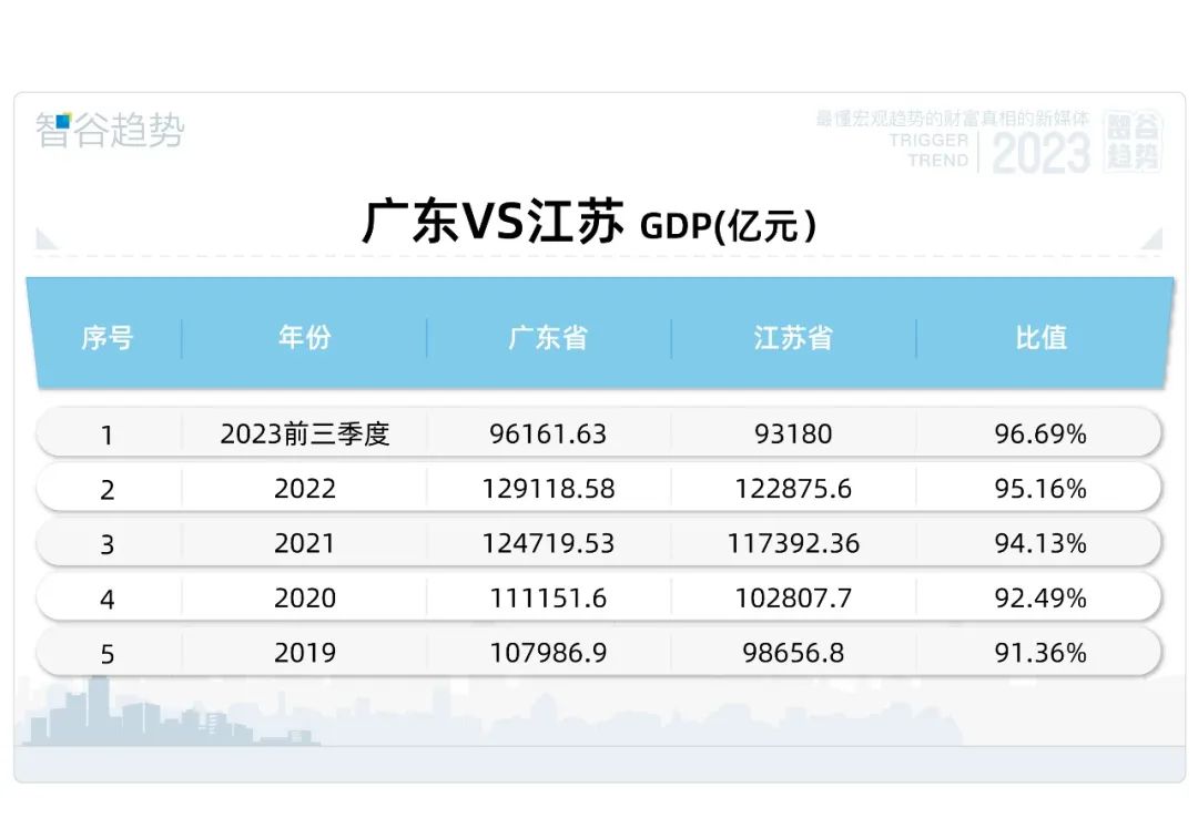 近两年来,粤苏二省的GDP差距正在逐步收窄。2022年,江苏与广东的GDP差距为6243亿,而2023年前三季度,双方差距收窄至2982亿。