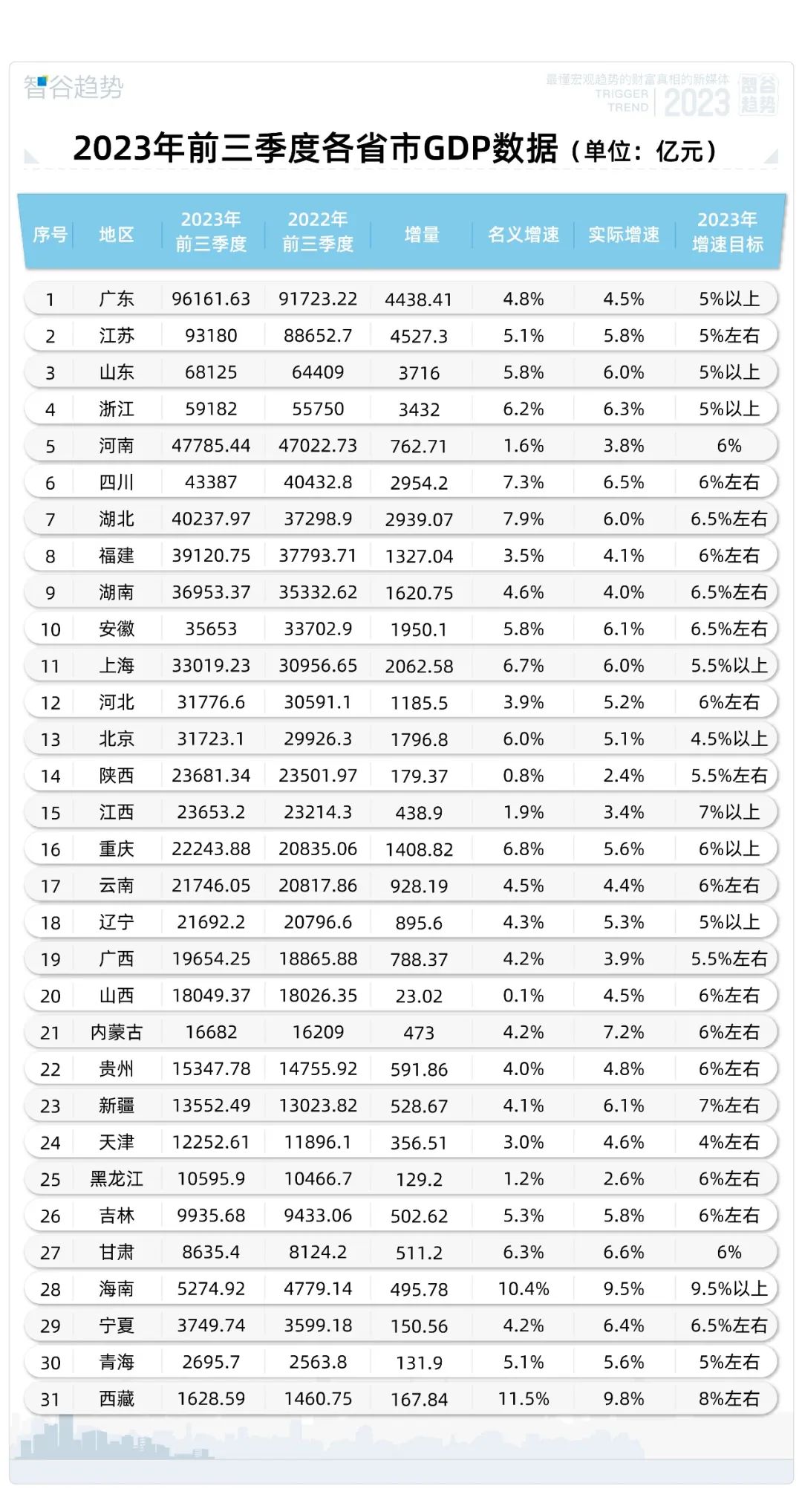 智谷趋势梳理了最新数据,一句话看点带你快速掌握31省市前三季度GDP的最新“战况”——