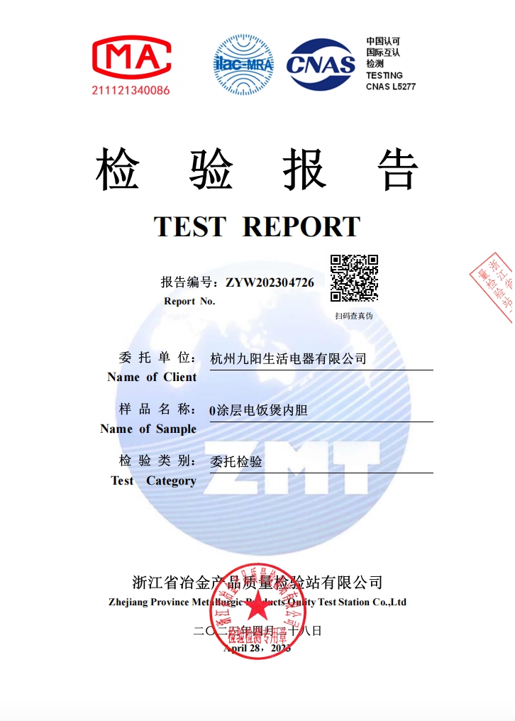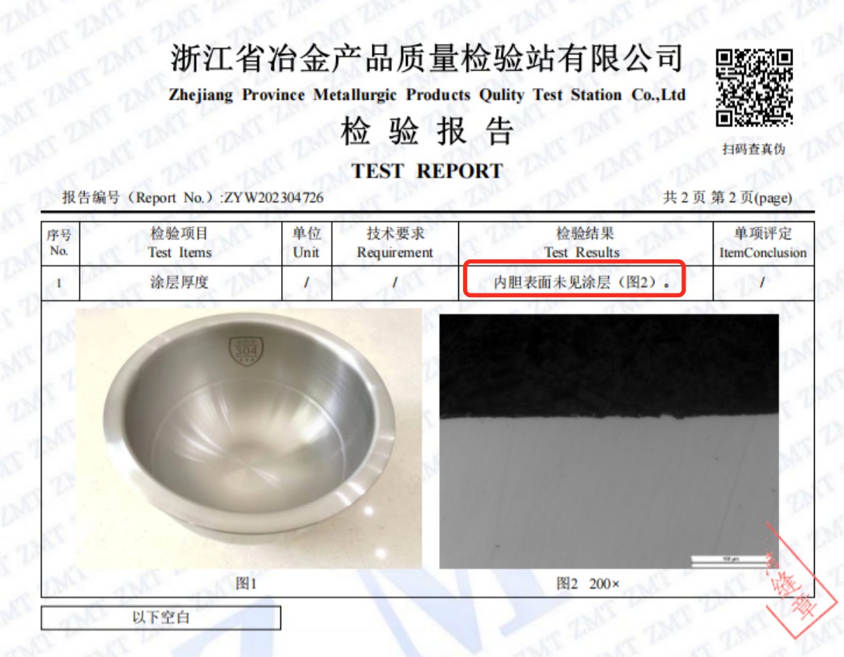 九阳0涂层内胆采用304不锈钢材质,是真正的0涂层内胆。内胆的内表面经权威第三方检测机构检验显示,检测结果为“内胆表面未见涂层”,参照《金属和氧化物覆盖层厚度测量显微镜法》(GB/T 6462-2005)。
