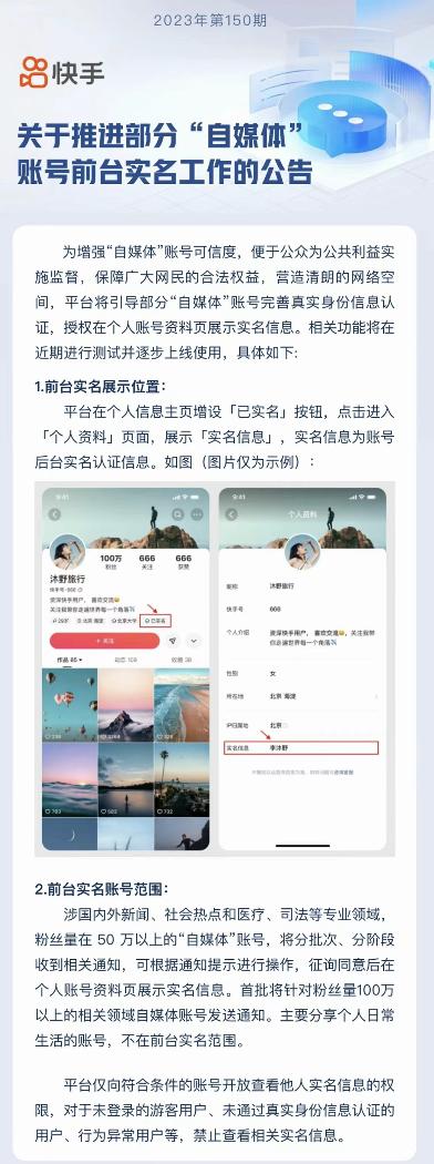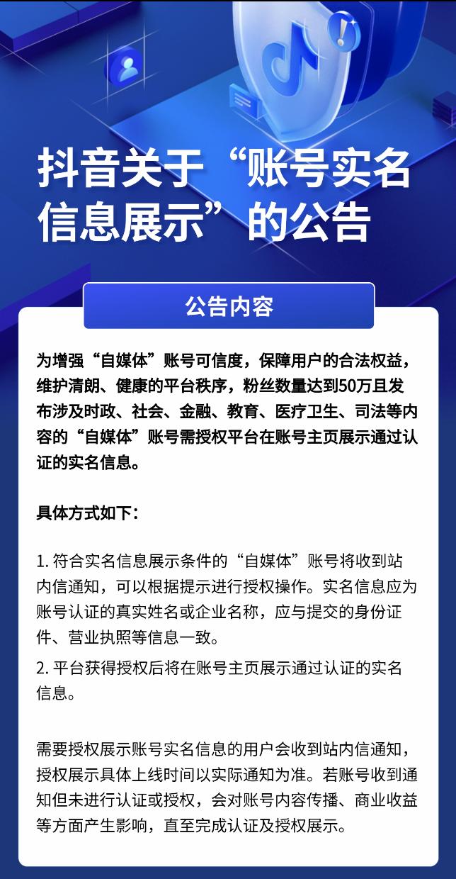 粉丝数量达到50万且发布涉及时政、社会、金融、教育、医疗卫生、司法等内容的“自媒体”账号需授权平台在账号主页展示通过认证的实名信息。