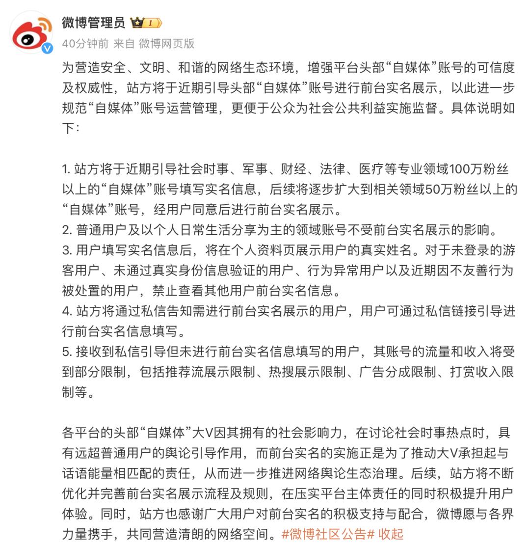 为加强“自媒体”管理,健全管理制度机制,维护良好的网络舆论生态, 社区将分批次分阶段引导粉丝量 50 万以上的“自媒体”账号进行前台实名展示。
