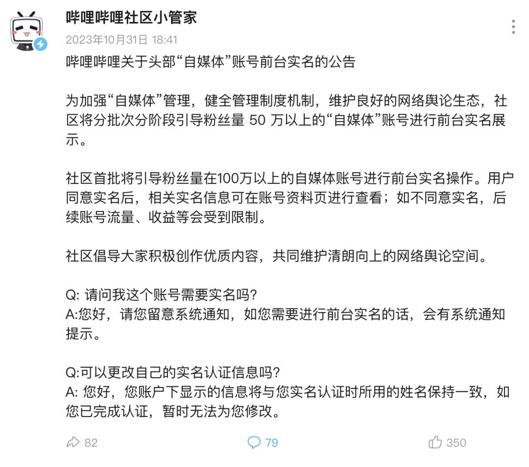 站方将于近期引导社会时事、军事、财经、法律、医疗等专业领域100万粉丝以上的“自媒体”账号填写实名信息,后续将逐步扩大到相关领域50万粉丝以上的自媒体”账号 ,经用户同意后进行前台实名展示。普通用户及以个人日常生活分享为主的领域账号不受前台实名展示的影响。