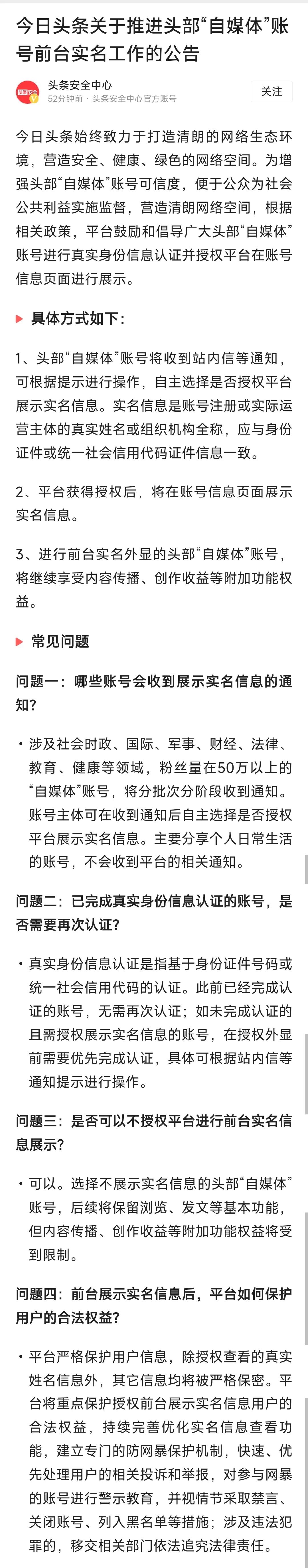 相关“自媒体”账号如不同意在前台展示实名信息,账号的经济收益、流量分发等权益后续会受到限制此次开展的前台实名信息展示工作,可以进一步提升头部账号的可信度,便于用户为公共利益实施社会监督,营造清朗网络空间。