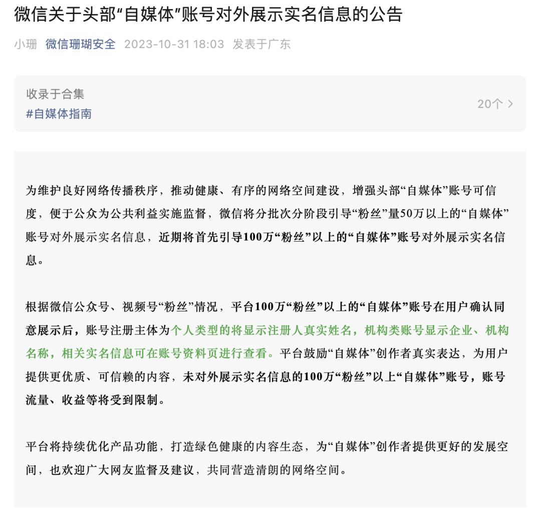 就在刚刚,微信发布了关于头部自媒体账号对外展示实名信息的公告, 近期将首先引导100万“粉丝”以上的“自媒体”账号对外展示实名信息 。