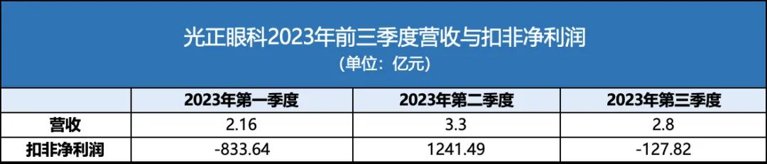 但从单季度来看,光正眼科的业绩恢复可持续性并不强。第三季度,光正眼科实现营收2.8亿元,环比下滑15%。扣非净亏损为127.82万元,环比由盈转亏。