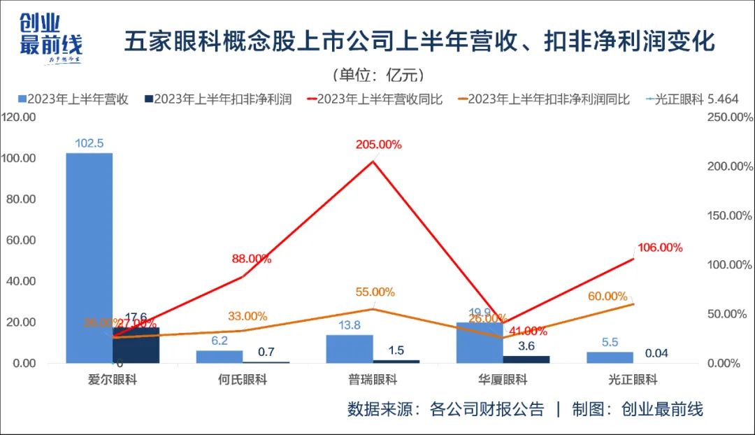 光正眼科业绩的增长主要来源于2023年上半年的突出表现,其营收、扣非净利润增速分别为60%、106%。