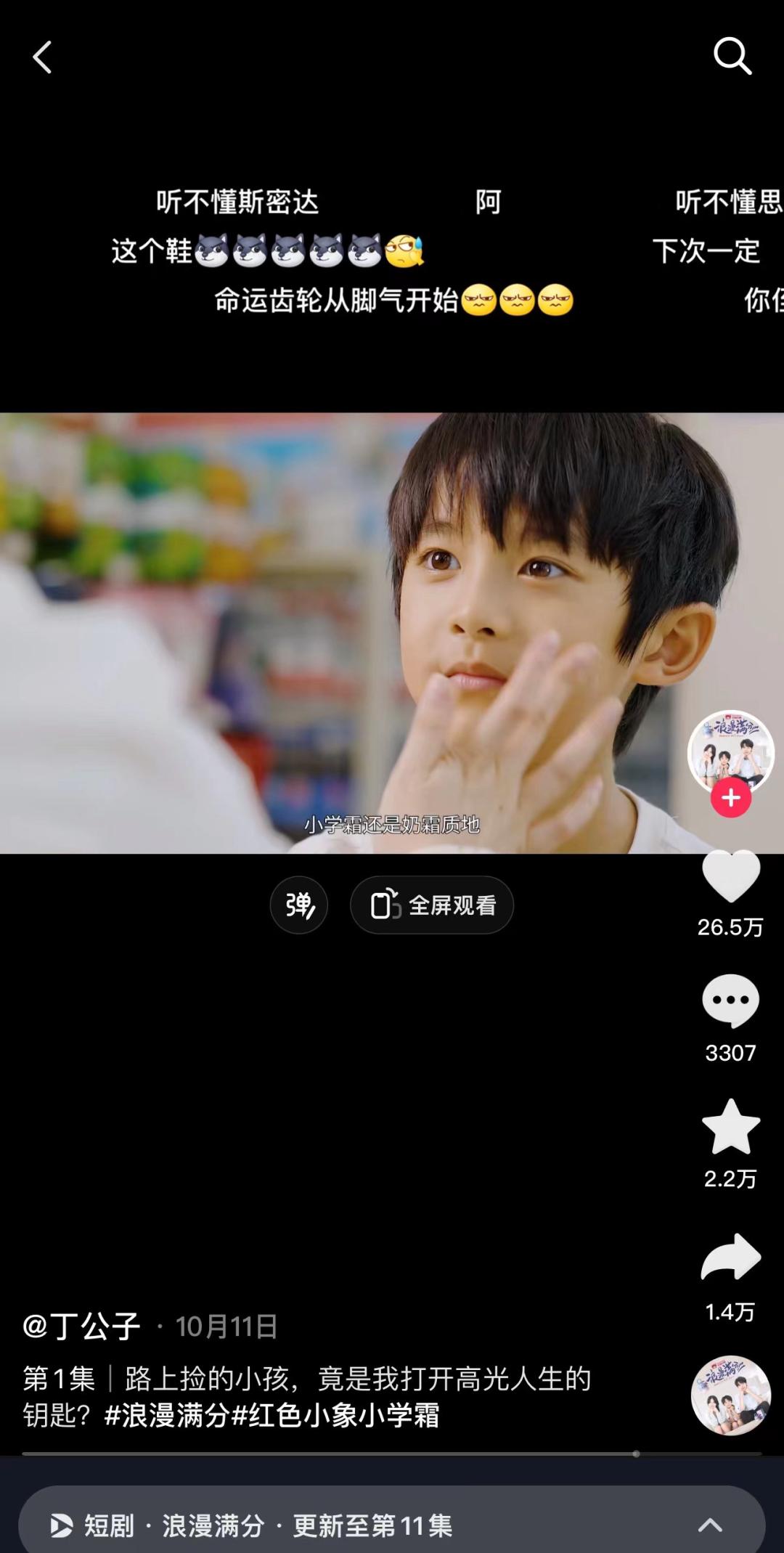 定制短剧就是品牌营销跟短剧结合的新模式。短剧《浪漫满分》就是红色小象小学霜跟姜十七合作的定制短剧。剧情从自带倒霉属性的阿丁意外救下“逃学”的小学生林林,由此阿丁成为林林的家庭管家展开。由于剧中小学生的设定,红色小象小学霜跟这个人物有着天然的贴合度,使用场景更加广泛,开辟了以剧带货的新模式。