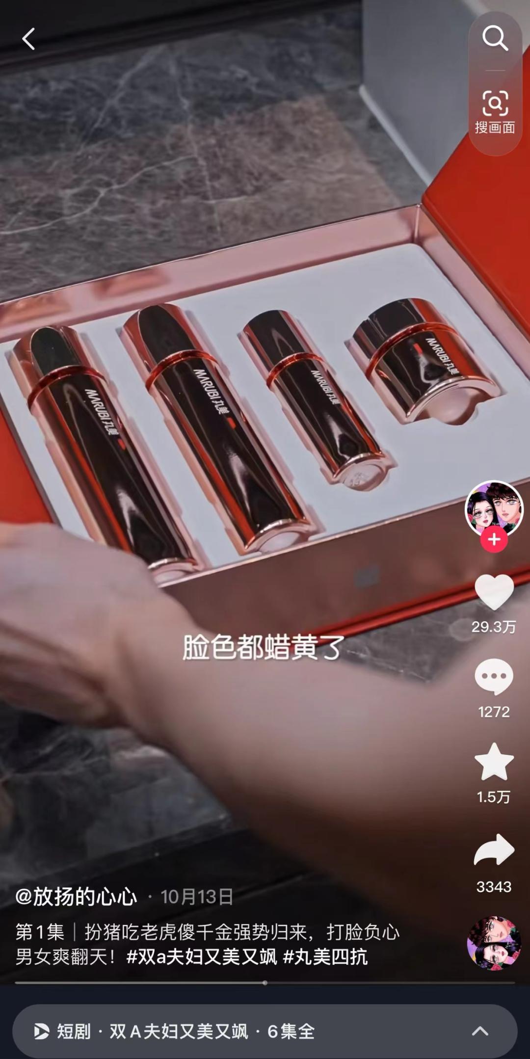 早在去年双十二期间,丸美独家赞助的短剧《靠近双子星》,就将主角设定成丸美总经理的身份,今年双十一期间,这一模式再度延续,短剧《双A夫妇又美又飒》中女主的设定是丸美集团的千金,这样的模式大幅提升了品牌露出的频次,也加强了剧情的合理性。