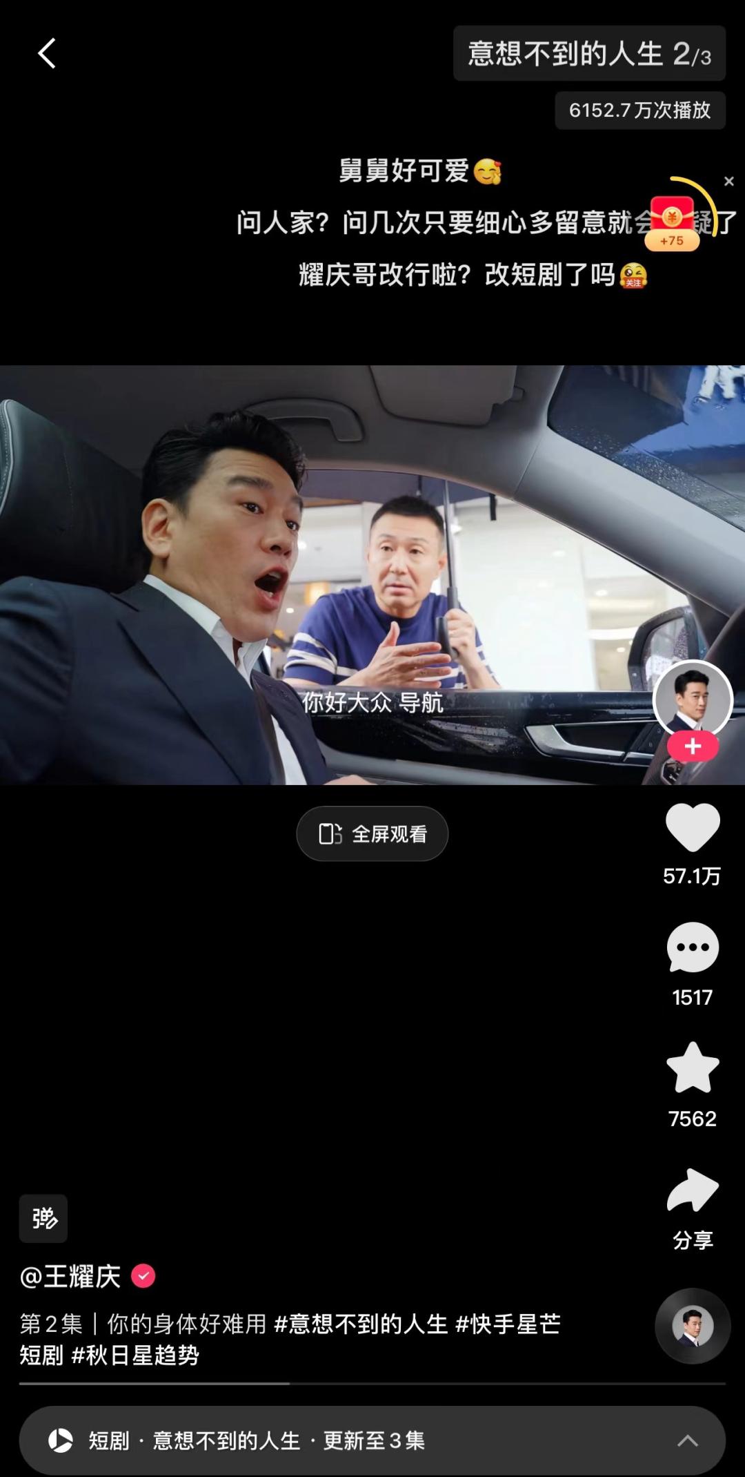 王耀庆深入人心的霸道总裁人设跟成功人士这个标签紧紧绑定,通过他来宣传途昂V6,也让车型外观硬朗、空间大、配置强的特点更具说服力。尤其值得一提的是,在短剧上线的两天前,王耀庆为上汽大众途昂V6拍摄的广告宣传片上线,可见角色跟品牌调性贴合在品宣上往往能达到事半功倍的效果。