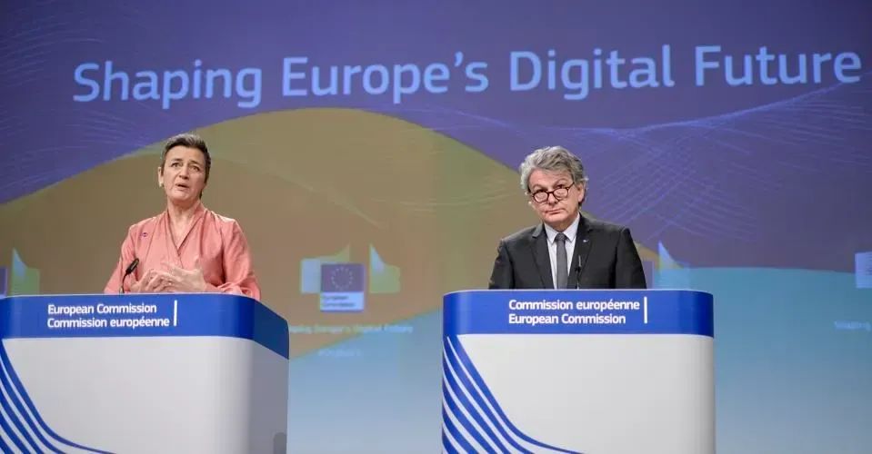 2020年2月19日,比利时布鲁塞尔。欧盟“适应数字时代的欧洲”委员会执行副主席Margrethe Vestager(左)和欧盟内部市场专员Thierry Breton在比利时布鲁塞尔欧盟委员会总部Berlaymont与媒体交谈。图片来源:Thierry Monasse/Getty Images