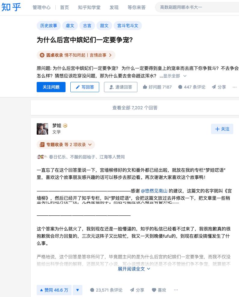 2019年,知乎用户梦娃在问题“为什么后宫中嫔妃们一定要争宠”中用故事化的方式回答,最终连载的回答成了火遍全网的网文《宫墙柳》;同一年知乎用户七月荔在问题“如果你是虐文里的女主你会怎么办”下创作了《洗铅华:恶毒女配生存录》;而马伯庸则根据“如果你来给《刺客信条》些剧情,你会把背景设计在哪里?”的提问写出了《刺客信条:长安》,其改编的电视剧《长安十二时辰》也大火。