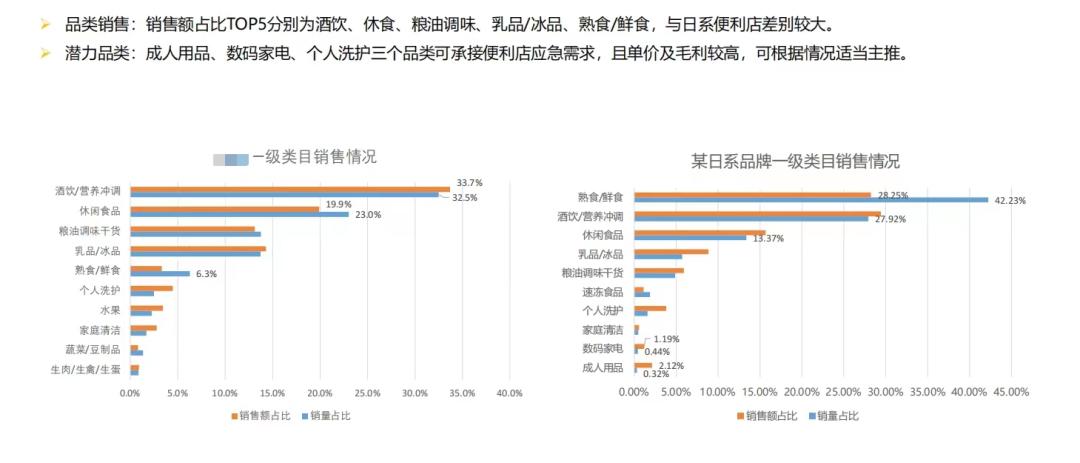 在给大家分享一组数据,左边是优同的即时零售品类销售占比,右边是某日系品牌的类目销售占比。