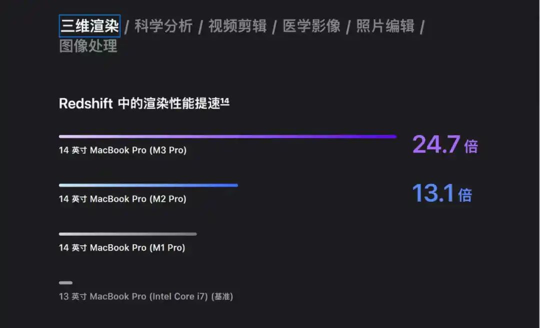 24.7倍!13.1倍!再看MacBook Pro(Intel Core i7),都快差几百倍了。每一次,苹果的对比都是让人吃惊的,但要知道,英特尔都已经被苹果“遗弃”多久了,三年了,英特尔芯片早就变天了,这样对比属实有点不公平。