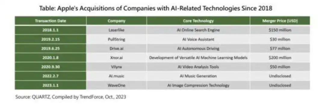 2018年起苹果收购AI相关公司案例不完全统计,图源丨集邦资讯