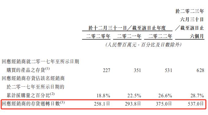 招牌产品销量下滑,没有卖掉的变成了库存。2020年、2021年、2022年及2023年上半年,经销商的存货周转日数分别为258.1日、293.8日、375.0日及537.0日,呈逐年上升趋势。