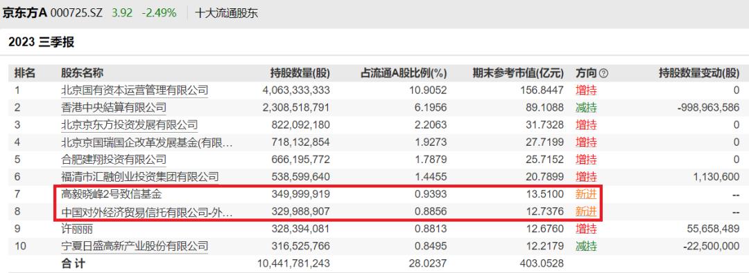 据京东方三季报披露,知名私募基金经理邓晓峰管理的高毅晓峰2号致信基金和高毅晓峰鸿远集合资金信托计划,在三季度进入京东方前十大流通股股东,合计持有约6.79亿股,粗略估算,其持股总成本超过25亿元。