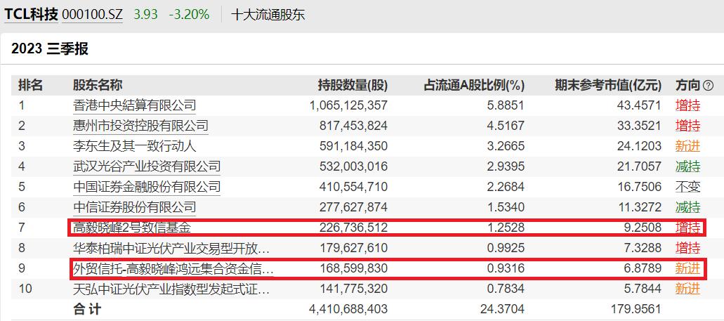 不仅如此,在三季度,高晓峰旗下的上述两只基金也是国内第二大液晶面板公司TCL科技的前十大流通股股东,合计持股约3.95亿股,持股市值约16亿元。其中,高毅晓峰2号致信基金在二季度就成为TCL科技前十大流通股股东,三季度继续加仓。