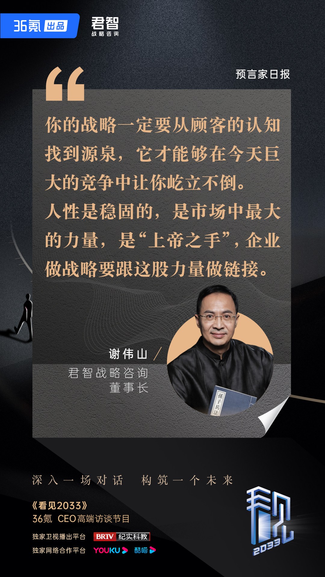 带着这样的疑问,36氪高端访谈栏目《看见2033》邀请了一位特别嘉宾——君智战略咨询董事长谢伟山。此档节目的主理人、36氪CEO冯大刚也期待,这位在战略咨询领域谱写过传奇的商业领袖,给出关于未来十年的可能性洞见。
