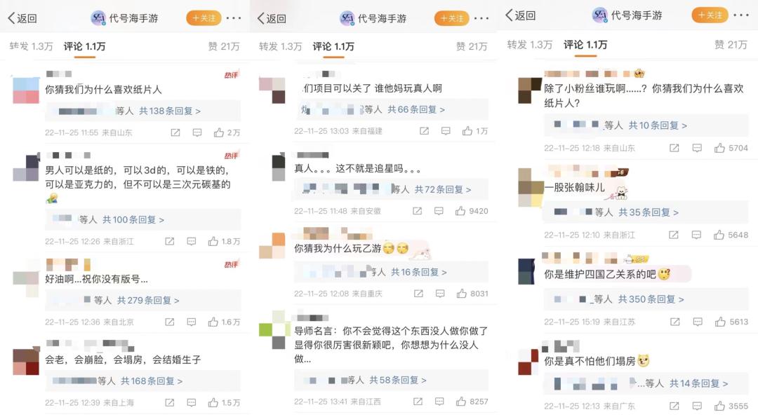《完蛋》之前,《代号:海》也出现过类似塌房现象。作为一款主打跨次元恋爱的真人乙游,官宣PV当天就被网友扒出来了其中一位男主已有女友,虽然后续官方澄清双方只是合作关系,但玩家仍然不买账,相关抵制的言论也刷屏微博评论区。