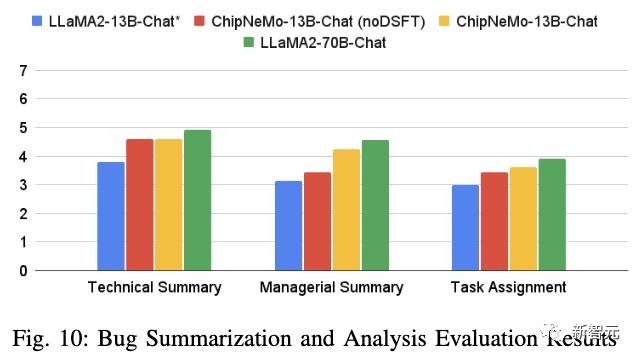 结果如图10所示,ChipNeMo-13B-Chat模型在所有三项任务上均优于基本LLaMA2-13B-Chat模型,分别将技术总结、管理总结和任务推荐的分数提高了0.82、1.09和0.61。