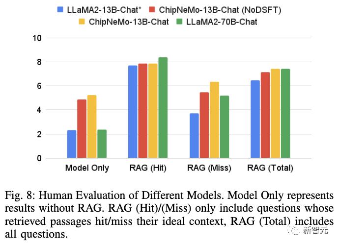 研究人员对使用和不使用RAG的多个ChipNeMo模型和Llama 2模型进行了评估,结果如图8所示: