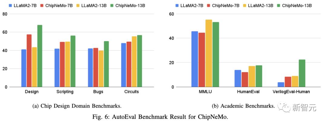 其次, ChipNeMo模型在芯片设计领域基准AutoEval和开放领域学术基准上的测试结果显示: