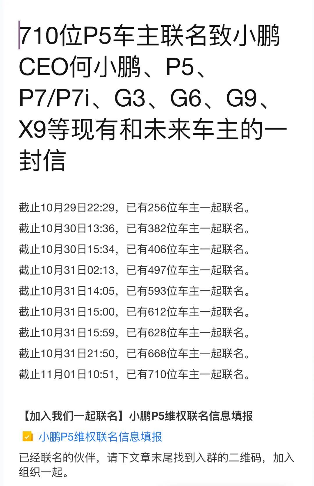 在此背景下,这些车主组建了维权群,并已有710位车主联名致信小鹏汽车董事长兼CEO何小鹏。在联名信中,这些车主希望小鹏汽车官方人员能够与车主取得联系,或者通过公告给大家合理的解释以及处理方案。