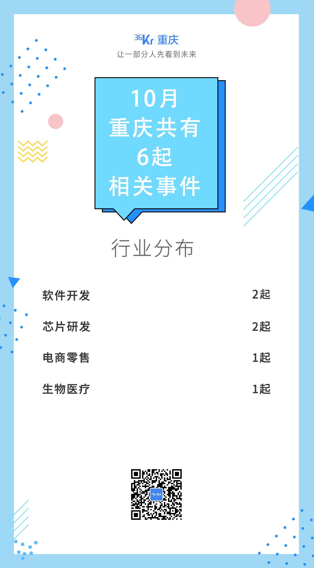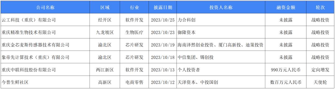 10月,36氪重庆通过爱企查查询,共收录与重庆相关的投融资事件6起,相关企业6家。其中:天使轮1家,今普生鲜社区;战略投资4家,精准生物、云工科技、象帝先计算技术、金芯麦斯;定向增发1家,中联科技。