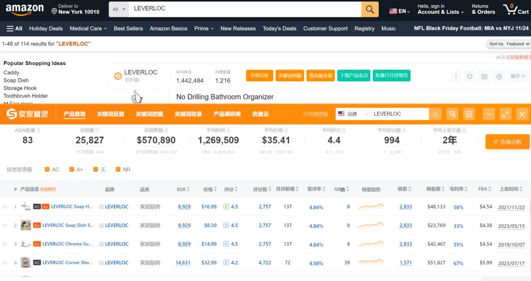 以LEVERLOC品牌旗下的83个ASIN为大致样本,卖家精灵www.sellersprite.com数据显示,其总销量达到了25827件,销售额为57.08万。