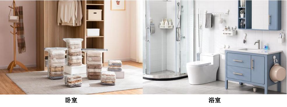 在卧室、浴室、厨房等都有该类产品的使用场景,比如,太力科技的平面式真空压缩袋,可以用来装棉被,抽空里面的空气,厚厚的棉被马上变成一层“纸”,大大缩小了体积,非常方便储存。