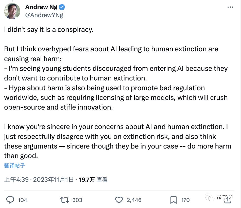 作为坚定的“AI有风险派”,他第一个不同意吴恩达。直接开帖“回怼”: