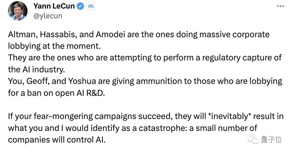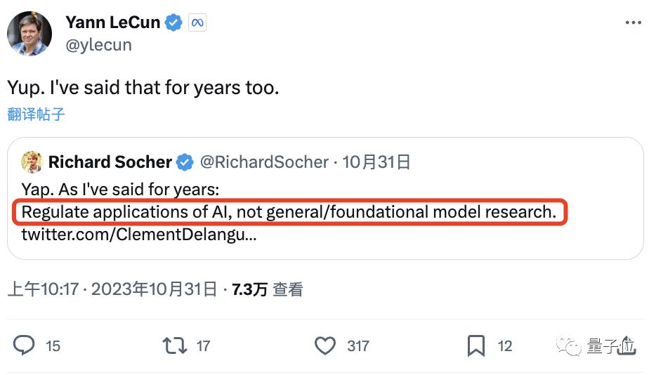 而更早一点,LeCun也转发了关于“大家应该做的,不是在这限制通用/基础大模型技术的研究,而是该去规范其应用”的帖子。
