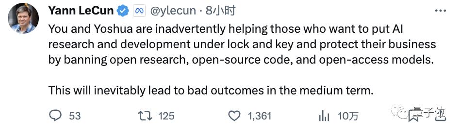 正是你和Yoshua的言论,才让那些想通过禁止开源来保护自己的AI研究和业务的人“得逞”。后果很严重。